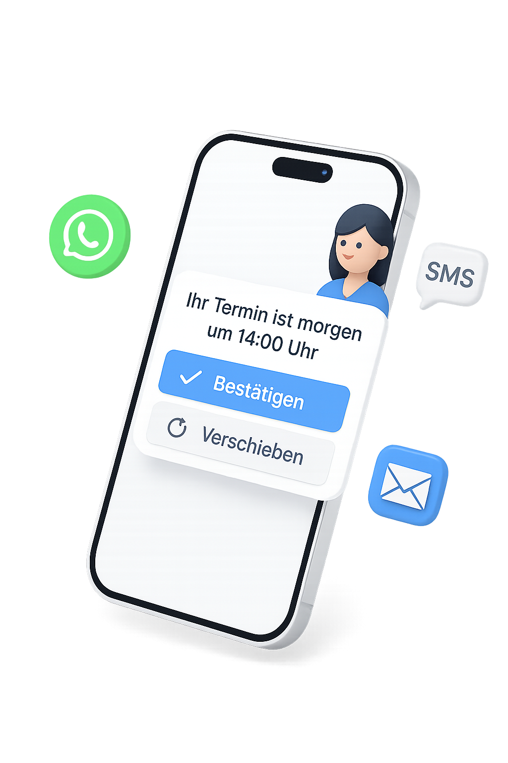 Deine Kunden erhalten rechtzeitig eine persönliche Nachricht – ob per WhatsApp, SMS oder E-Mail – und können den Termin mit nur einem Klick bestätigen oder verschieben.